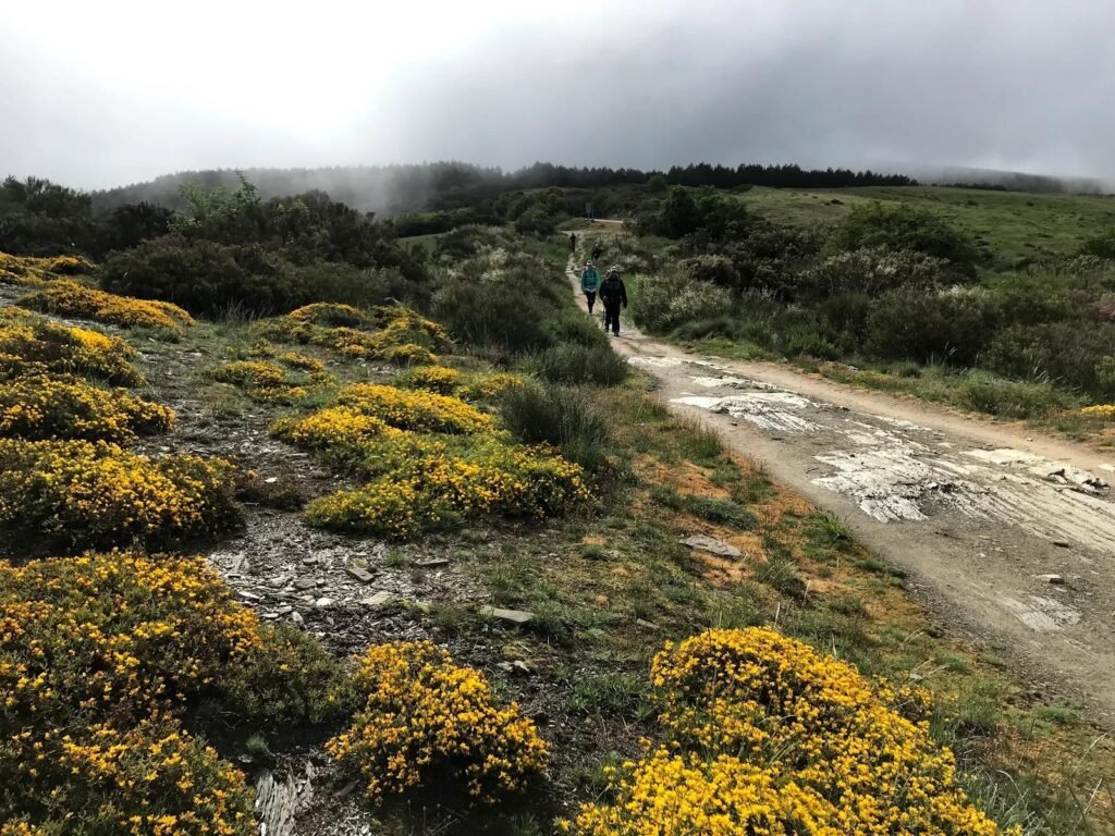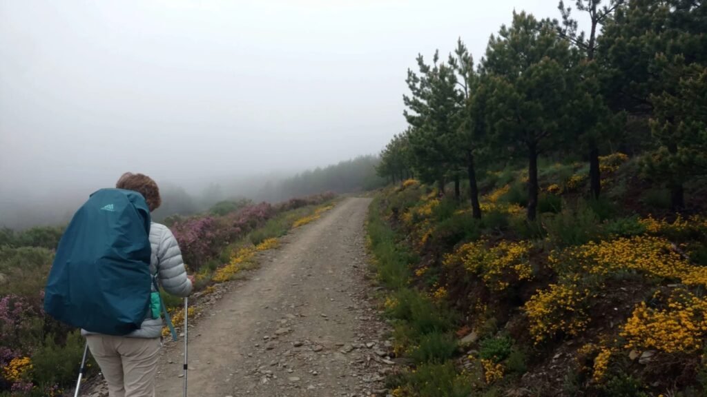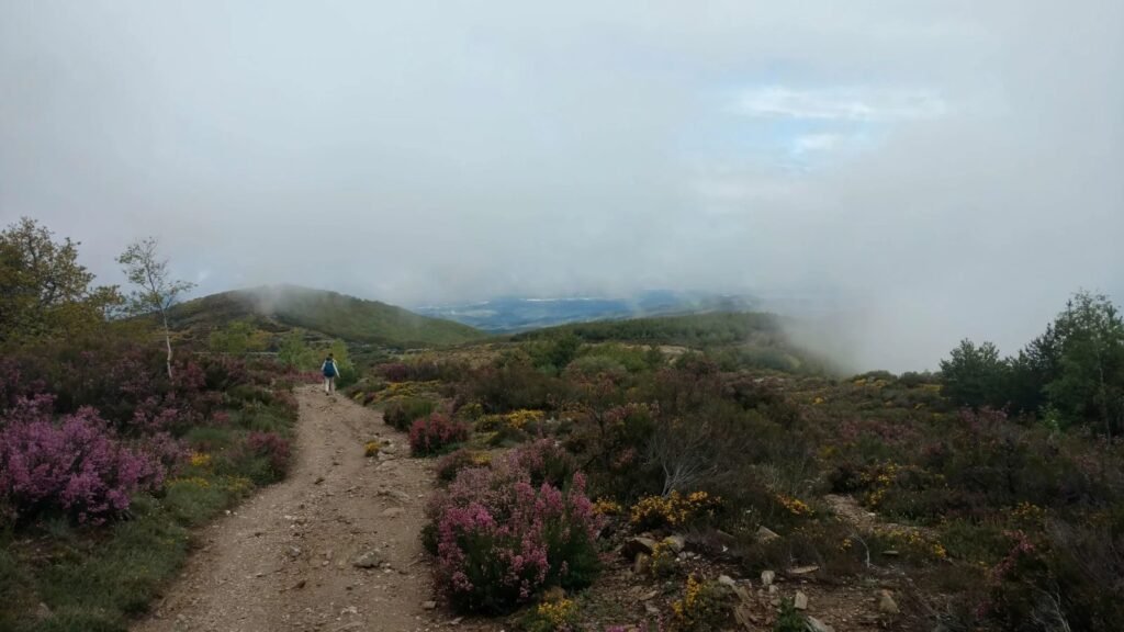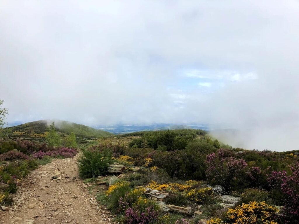We started towards the highest point. Spirits were high. This part of the Camino is so beautiful. As we made our way along this beautiful path, we laughed, had deep conversations, had quiet time, and sang a little. The fog was still hanging low, we hoped it would lift so we could get some beautiful views.