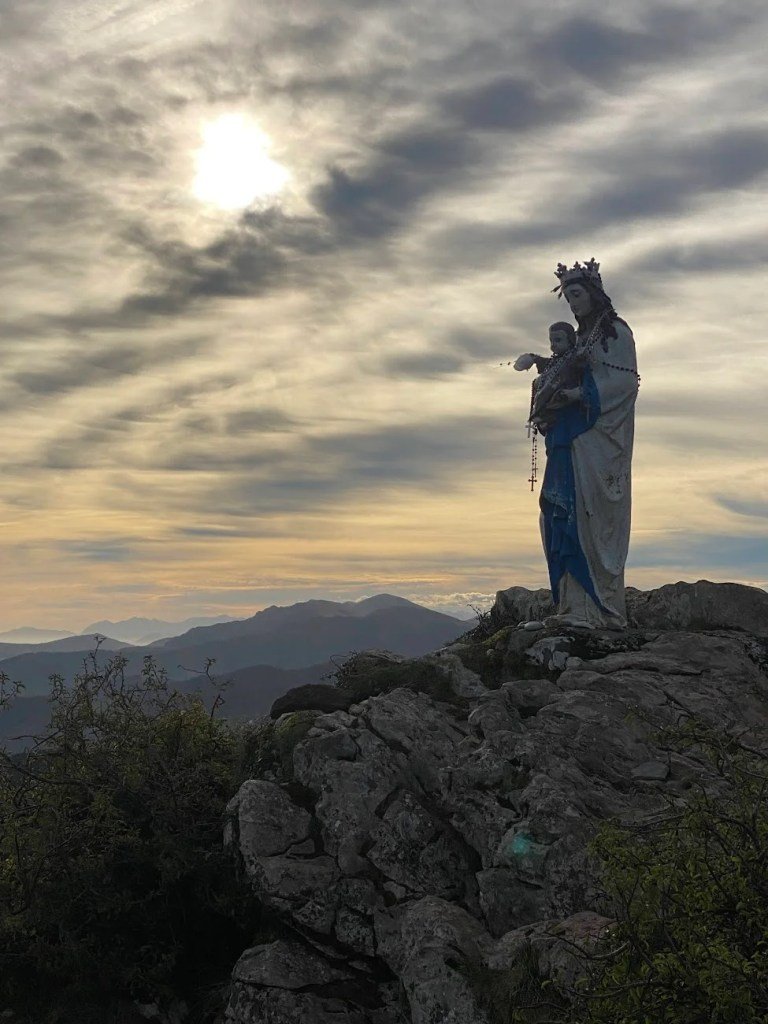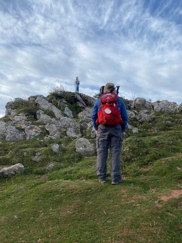 Our Lady sits off to the left atop a pile of rocks at the highest point. Make sure you stop and take a moment, say a prayer, and be present! Remember you are walking across the Pyrenees along the Camino de Santiago.