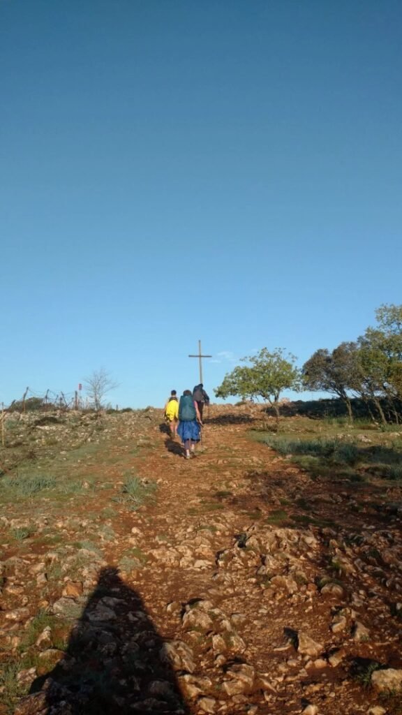 The terrain was nice, mostly dirt paths this morning. As we left Ages we were going downhill which quickly turned to an incline. The path was nice and at the top of the hill was a huge cross. We decided it was a great spot for some photos.