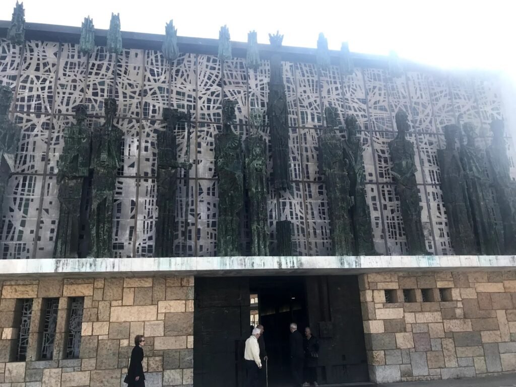 We passed the church in the town, the sanctuary of the Virgin, La Virgen del Camino. On the front are huge bronze statues of the 12 Apostles, with St. James above the door and the Virgin floating above them all.