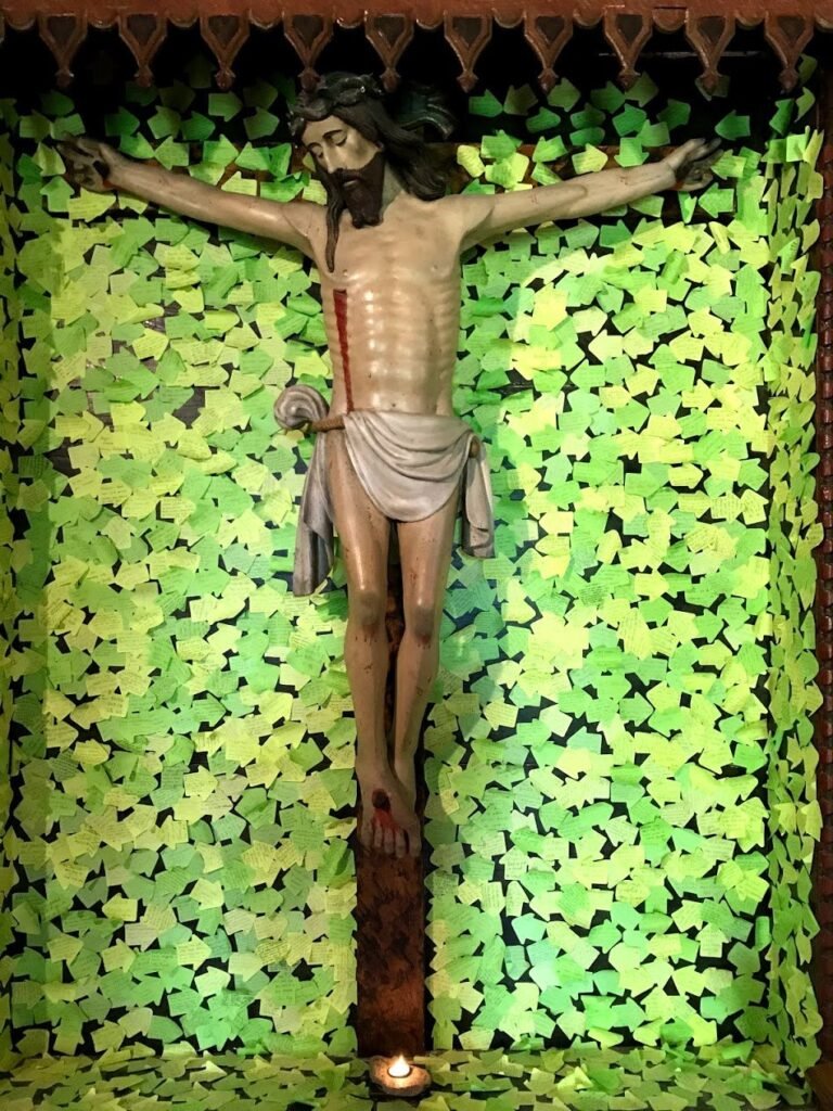 We were encouraged to climb a stone spiral staircase and ring the bell in the belfry. She then informed us that the bell is said to be the oldest in the whole region of Navarra Spain. As we entered the church, it was cool and dark. A crucifix hung with neon green arrow post-it’s surrounding it. Looking closer, these were personal notes, written in many languages left by the pilgrims. She encouraged us to write our message or prayer on a sticky note.