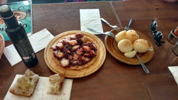 As we walked up to the main street, the Galician restaurant where we will eat lunch was on the corner. I first ate here back in 2013 on my first Camino. I had shared that with everyone and told them it’s a great spot to try the famous Octopus, Pulpo. As we arrived at the restaurant the first thing you see is a gentleman standing in a window trying to sell everyone the Octopus.