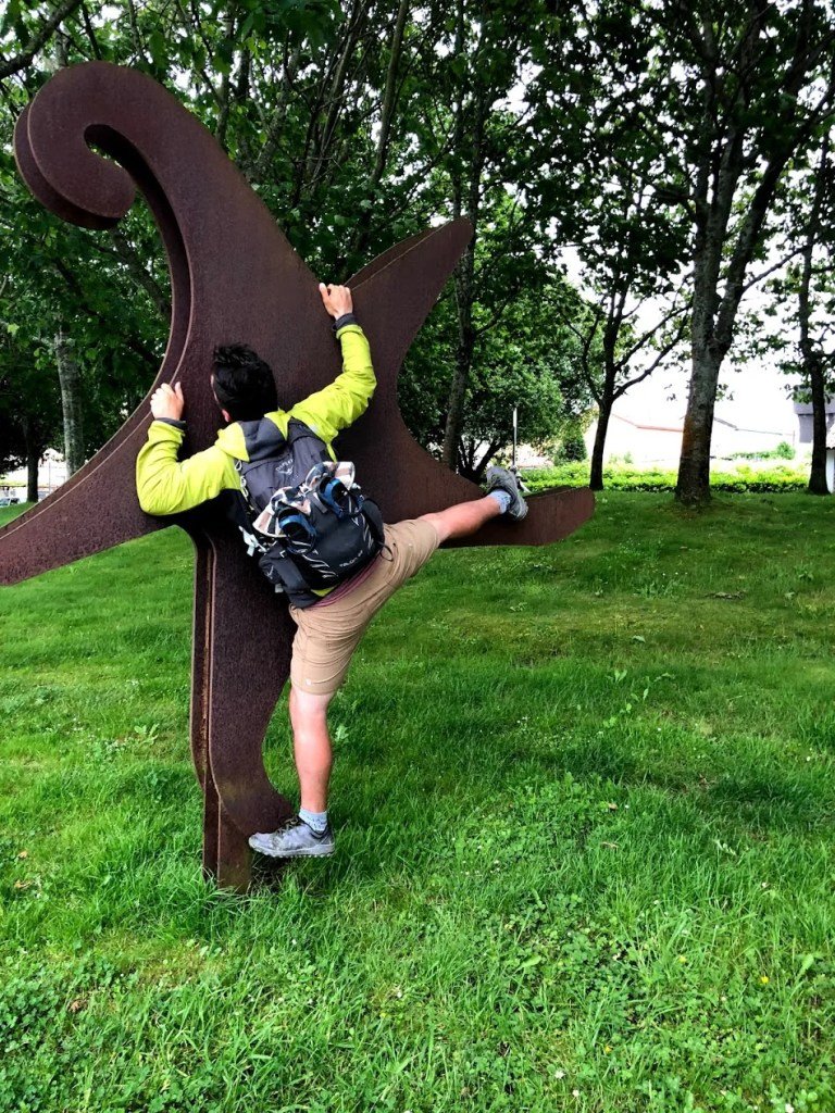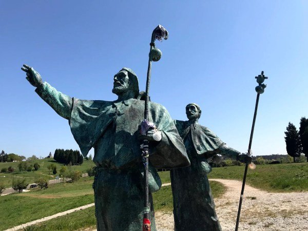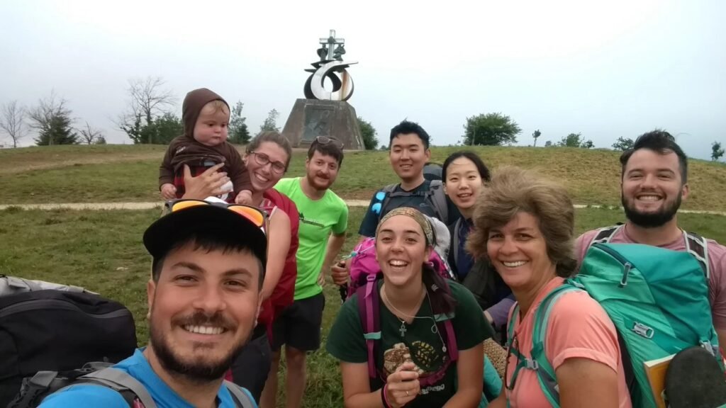 The monument was built to commemorate the visit by Pope John Paul II in August of 1993 where he said a mass for thousands, on that year’s World Youth Day. The pilgrim statues, which point to Santiago, are on a hill to the left of the monument. I pointed it out to everyone and asked if they wanted to walk over to them, it was a little distance and we all decided to skip it since we did see the towers from the hilltop. The pics of the statues below are from a different Santiago pilgrimage I walked.