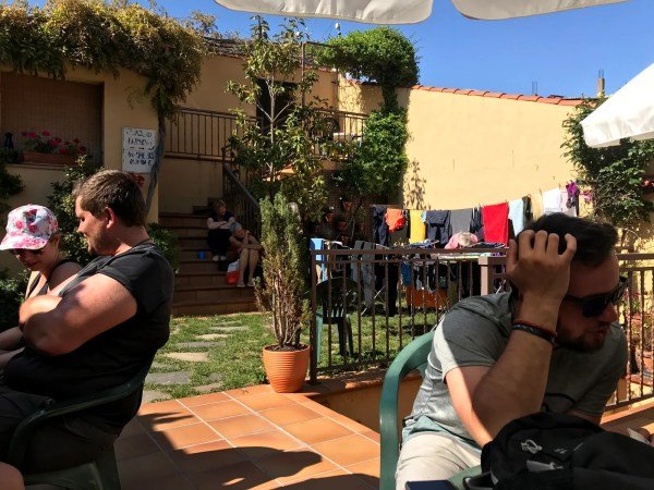 It was a neat little place; it had a small kitchen and three or four rooms, each with about eight bunks. My favorite part was the outside courtyard in the back. Chairs, tables and plenty of places just to hang out. I was hoping the rain would miss us so we could enjoy this patio.